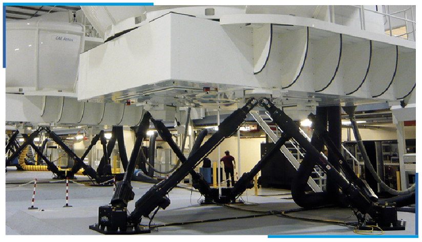 Robusta base metálica triangular con 6 actuadores lineales eléctricos activados por servomotores, unidos en la parte superior por otra robusta base metálica triangular.